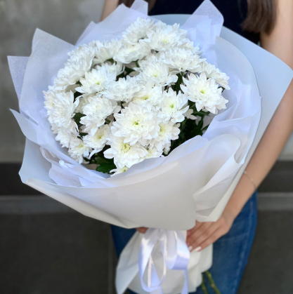Пышный букет из кустовых хризантем с объемной упаковкой. Кустовые хризантемы имеют множество бутонов и обширные кусты, которые создадут магический и завораживающий эффект. Объемная упаковка из тишью добавит дополнительный элемент масштаба.