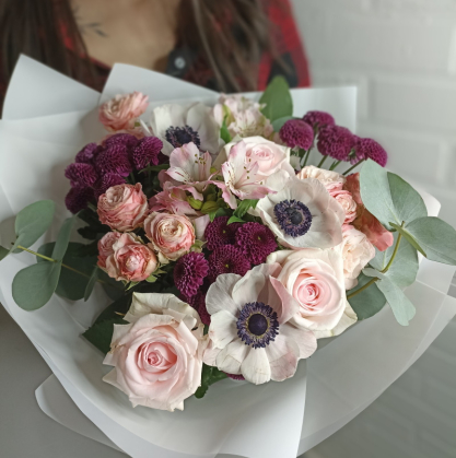 Потрясающий букет из белых анемонов с добавлением пионовидных роз Бомбастик, альстромерии, сиреневой сантини и эвкалипта.