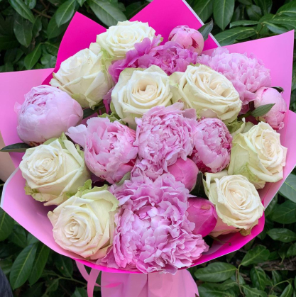 Купить пионы и белые розы в упаковке | Цветы с доставкой в Ступино