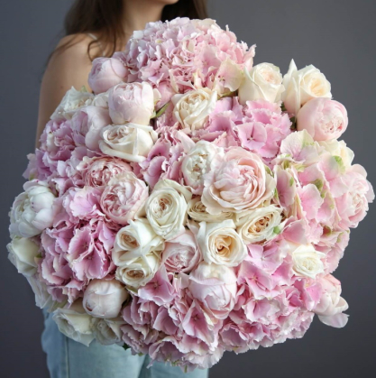 Большой букет из гортензий, пионов и пионовидных роз