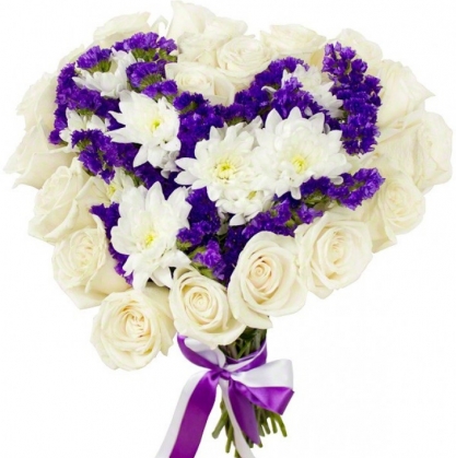 Букет сердцем из роз, хризантем и статицы | Купить в Ступино