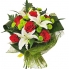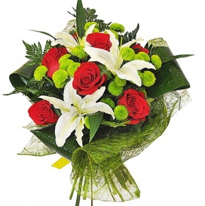 Букет из роз, лилий и кустовой ризантемы с добавление зелени в натуральной упаковке