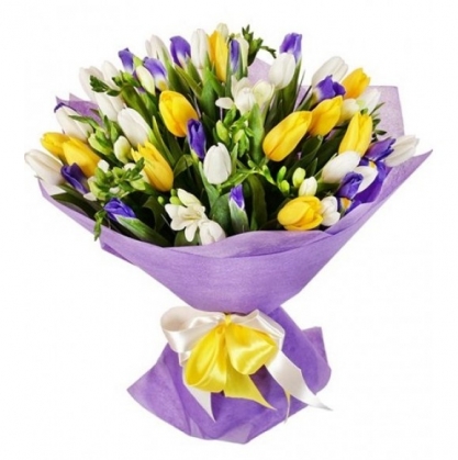 Букет "Три желания" из тюльпанов, ирисов и фрезии | Купить в Ступино